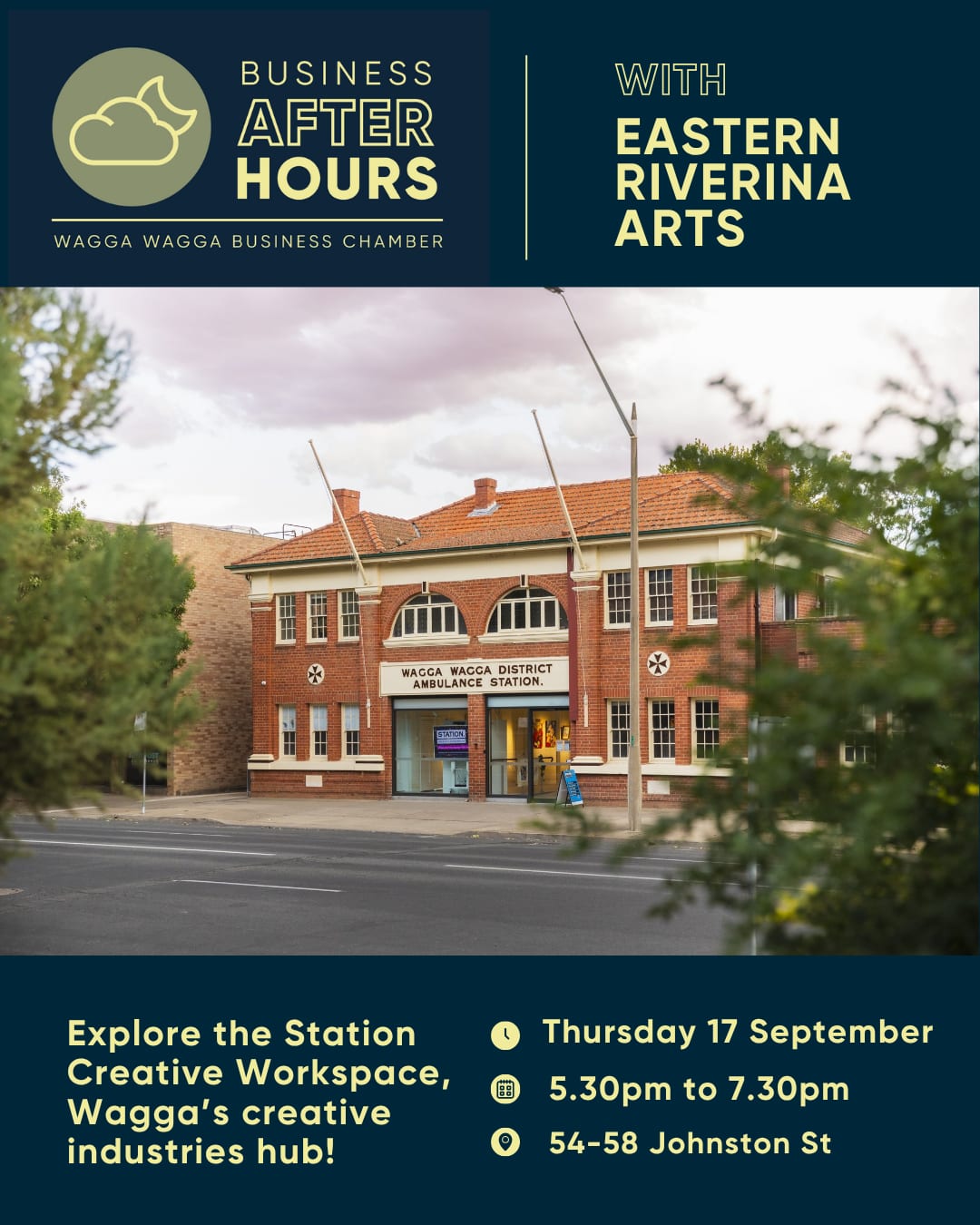 Join us for an evening exploring the Station Creative Workspace, a creative hub Located in the Old Ambulance Station in Johnston Street, Wagga.