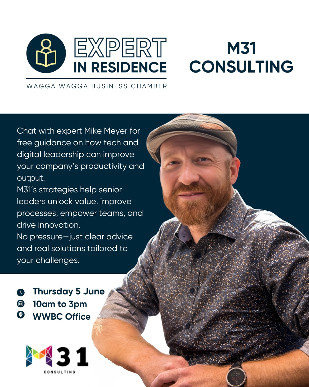 This is your chance to have a one-on-one, casual chat with Mike Meyer from M31 Consulting. No presentations. No pressure. Just practical, tailored advice for Chamber Members looking to bridge the digital leadership gap.